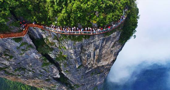 棧道全長1600米,平均海拔為1400米,起點是倚虹關,終點到小天門。與其他棧道不同的是,鬼谷棧道全線既不在懸崖之巔,也不在懸崖之側(cè),而是全線都立于萬丈懸崖的中間,給人以與懸崖共起伏同屈伸的感覺。 站在棧道上俯瞰群山,古人“會當凌絕頂,一覽眾山小”的感覺油然而生。由于天門山是國家森林公園,植被特別豐富,加上典型的喀斯特地貌,所以,在這條棧道上更能找到一種在乘坐直升飛機飛越熱帶雨林大峽谷的感覺,這平時只能在電影里看到的場景,在這里能讓你身臨其境。 由于海拔和氣流的影響,很多小鳥都不能到達與棧道平行位置。所以,站在這里,腳下是沒有邊際的綠野,成群的小鳥在峽谷中嬉戲,偶爾有老鷹從眼前掠過,閉上眼,挺著發(fā)麻的雙腿,帶著急促的心跳,伸開雙臂,你就能得到一次最完美、最刺激、最貼近自然的SPA。因為,要知道這種在懸崖上賞風景一般都是非人類所能享受的。 如果是雨前雨后,在棧道上則是身邊霧氣盤繞,腳下云海翻騰,令人抬腿似生霧,邁步如踏云,人間天界,世外洞天也就是如此了。 據(jù)施工人員介紹,此條棧道也是他們所修棧道中施工最難,最險峻的一條。如果您還覺得不夠刺激的話,在棧道的完結(jié)處的兩個懸崖之間有一條長160米的懸索吊橋,同時,在海拔最高點還有一個挑戰(zhàn)心里極限的玻璃站臺,在這里,如果你能挺直腰板伸開雙臂,那么,您就是真正的勇士了。