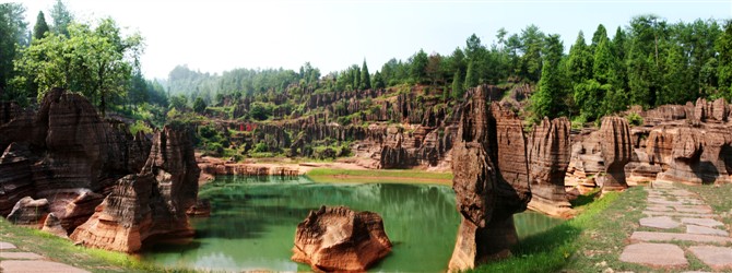 在眾多的奇觀絕景致中,最以“巨人園”,“古城故宮”,“八封奇陣”和“諸葛藏書(shū)”等景色最佳。石林東部有一尊高 12.26米的石柱,巍然聳立,挺拔偉岸,其神態(tài)模樣酷似領(lǐng)袖人物的雕像。神奇的是,再換一角度觀之,又極似立于川上,抒發(fā)“逝者如斯夫”感嘆的孔夫子。而位于另一旁的兩尊高大石柱,恰如從容就義的巾幗女英雄和屈子行吟圖,令人肅然走敬。因此,人們?yōu)檫@里的紅石林起了一個(gè)響亮動(dòng)聽(tīng)的別名----巨人園。