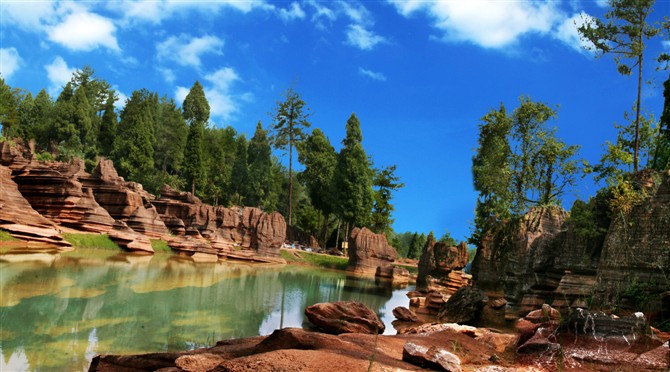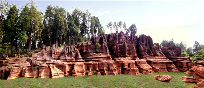 據(jù)地質(zhì)專家考證:紅色石林巖石形成的歷史約4。5億年,地質(zhì)史上稱之為揚(yáng)子古海(海底沉積了大量混合泥沙的碳酸鹽物質(zhì),經(jīng)地殼運(yùn)動(dòng)和侵蝕、溶蝕作用形成了這片美麗的地質(zhì)奇觀)。景區(qū)內(nèi)遍布高大奇石,造型各異、顏色變化多端,且隨天氣、時(shí)間、季節(jié)變化而變化,晴紅雨黑、陰轉(zhuǎn)褐紅、晨昏有別。 景區(qū)內(nèi)石景有:蜀犬吠日、乳燕待哺、樓蘭古城、蝸牛搬家、七彩迷宮、利劍刺空、航母巡游、石兵列陣、少女出浴、觀音坐蓮、石鞭候主、靈龜探海、粽熊迎客、天狗吠日、水獺望云、母雞搗窩、駝鈴聲聲····尤以“巨人圓”、“古城故宮”、“八卦奇陣”、“諸葛藏書(shū)”為奇石絕景中的最佳。 景區(qū)內(nèi)還有地下溶洞、絕壁天坑、神秘地坑、千年古木、土家山寨、土風(fēng)民俗、集商遺址····
