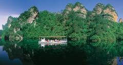 寶峰湖,位于世界自然遺產(chǎn)地武陵源,是張家界精品旅游線路之一。其核心景區(qū)是長(zhǎng)2.5公里、寬200至1000米,平均深72米的寶峰湖,這是目前武陵源世界自然遺產(chǎn)唯一以水為主的旅游景點(diǎn)。寶峰湖地處高山之間,接納自然水流,絕無(wú)人為污染,因而水質(zhì)清冽,為人稱道。湖的四周,是數(shù)座綠樹簇?fù)?、形態(tài)各異、刀劈斧削的砂巖石峰。至若蕩舟湖中,則見湖面如鏡,奇峰綠樹盡映湖中,呈現(xiàn)出一幅美妙的上下對(duì)稱的山水畫,意趣無(wú)窮。