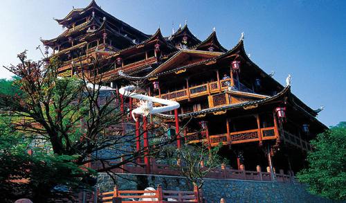 九重天世襲堂是土家風情園的精華和靈魂所在。該建筑由土家民間藝人李宏進設計,依80度陡坡而建,高48米,共9重12層,整個樓房全部用木栓連接,沒有一顆鐵釘,堪稱土家族建筑史上的奇跡。2002年9 月22日,九重天吊腳樓被載入世界吉尼斯世界紀錄,認定其為目前中國最大、最高、最完美的木質(zhì)結(jié) 土家風情園構(gòu)吊腳樓。